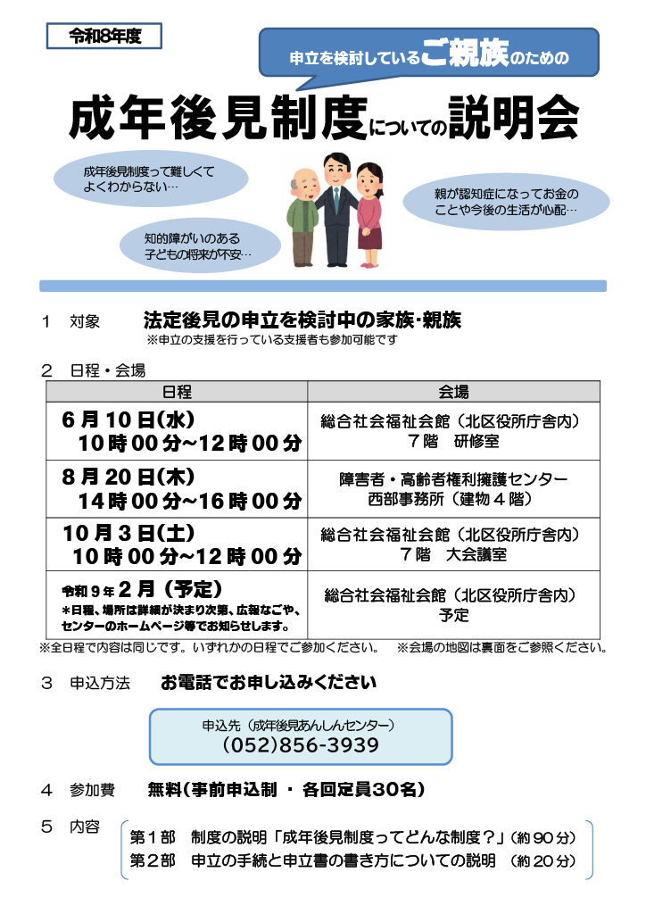 成年後見制度の利用を考えているご親族を対象とした、成年後見制度の説明会(参加無料)を開催いたします。ご親族に限らず、支援に関わる福祉関係者等の参加も可能です。